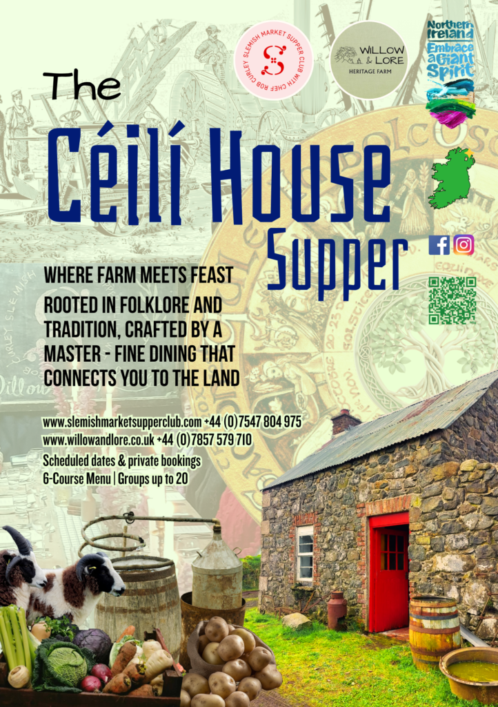 A mouth–watering collaboration delivering an authentic rural farm to fork feasting experience immersed in tradition and folklore. The Céilí House Supper, a Slemish Market Supper Club pop-up dining experience with Willow and Lore heritage farm.