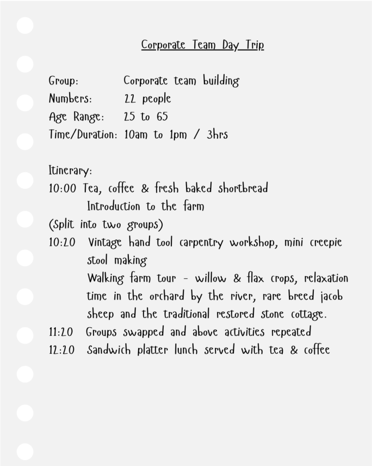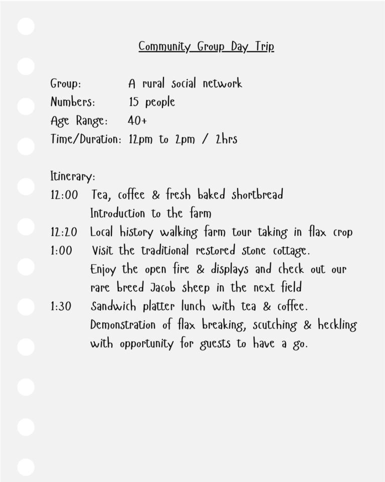 Scroll down through some examples of itineraries we have delivered for large group bookings, club outings, community associations, corporate teams, schools, family and friends groups. These include visits from two hours up to two days. We are very happy to put together tailor-made itineraries to meet budgets, durations, numbers, abilities and interests. Give us a call to discuss.